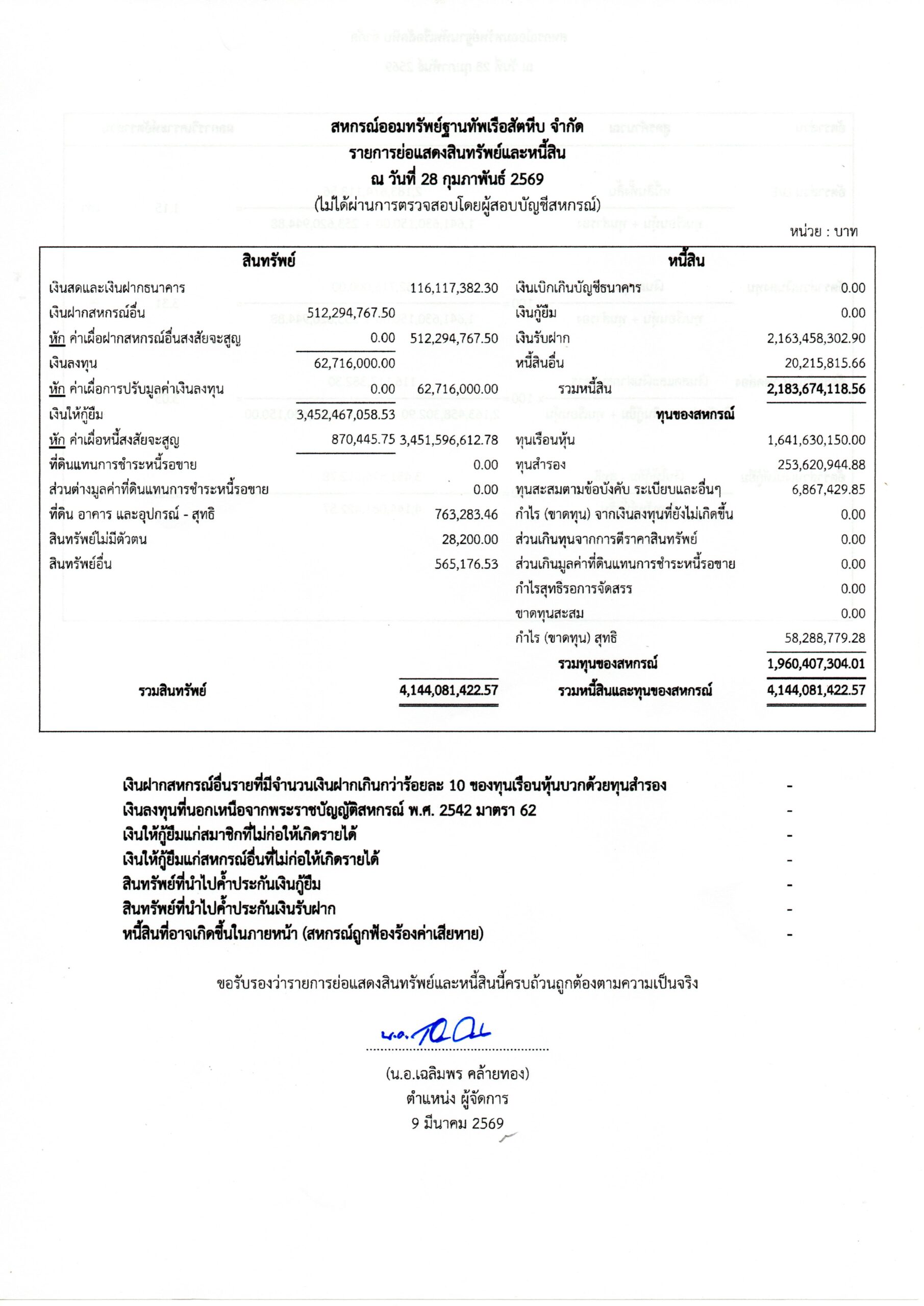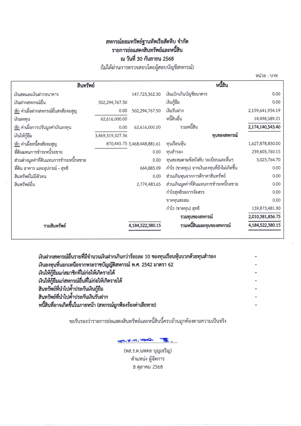 รายการย่อแสดงสินทรัพย์และหนี้สินของสหกรณ์ออมทรัพย์ ฐานทัพเรือสัตหีบ จำกัด ประจำปี 2566-2568 มีรายละเอียดดังนี้